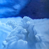 В центре композиции вновь предстает величественное облако, но на этот раз оно окутано более драматичной атмосферой. Если в первой работе оно купалось в ярком солнечном свете, то здесь оно словно освещено изнутри, или же контрастирует с темной, глубокой синевой неба. Белые, объемные формы облака, проработанные с поразительной точностью, излучают мягкий, рассеянный свет. Художница филигранно передает переходы от ярко-белых пиков к более мягким, серым и голубоватым теням, создавая ощущение невероятной глубины и реализма.