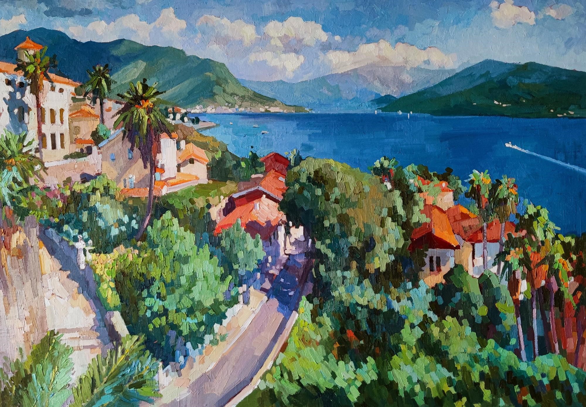 The painting transports the viewer to a sunny seaside town, immersed in greenery and surrounded by majestic mountains. Narrow streets, tiled houses and slender palm trees create an atmosphere of southern comfort and serenity. The azure sea sparkles brightly in the sun's rays, and the horizon is framed by the soft outlines of distant mountains. The sky, decorated with light clouds, emphasizes the depth and harmony of the composition. This scene breathes warmth and light, inviting the viewer to enjoy the peace and beauty of seaside life, admire nature and feel the serenity of summer.