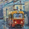 The painting depicts a red and yellow tram smoothly moving along the city streets wet from a recent rain. Glares of light are reflected in puddles and on the metal surfaces of the carriage, adding liveliness and dynamism to the composition. The background is formed by old buildings, creating an atmosphere of coziness and nostalgia. The artist uses energetic brushstrokes to convey the feeling of movement and the play of light. The painting is filled with the melancholic charm of a quiet city morning, when the noise of the bustle of the city has not yet managed to disturb the harmony of the moment.