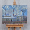 Scenic view in frosty sunny weather. Thick smoke is pouring from the chimneys, the girl is watching the industrial landscape.