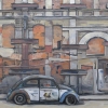 Painter was impressed by the old house of the 19th century in the center of the city, which once had trading shops, and even acted in films. It was rebuilt many times, ready for restoration and its walls are a picturesque texture of the layering of the time. The retro car in the foreground is selected the same way.