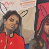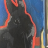 Opposite the observer sits and thinks something about these girls. And a big black rabbit is sitting next to it. Maybe the bunny is a girls' dream or an observer's fantasy.
