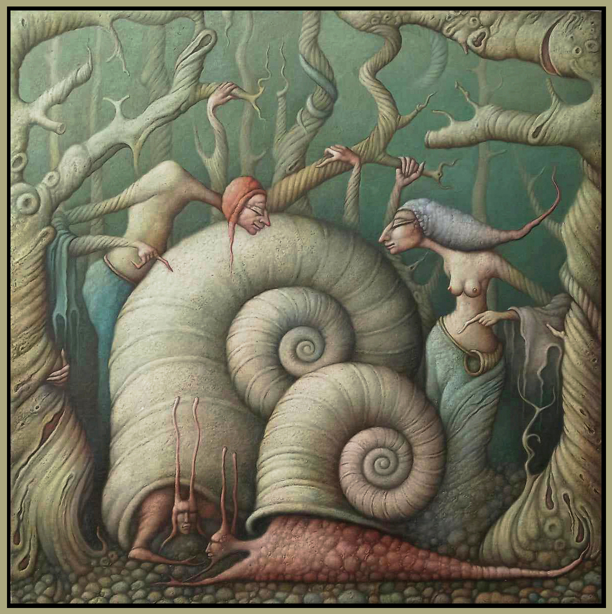 Vladimir Petran masterfully uses details to create a fairy-tale atmosphere. His brushstrokes are precise and neat, conveying the texture of skin, shell, and leaves. The color palette is muted and earthy, dominated by greens, browns, and grays, which creates a feeling of naturalness and organic quality despite the fantastical imagery.