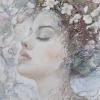 At the center of the composition is the profile of a woman’s head, enveloped by apple tree flowers and branches. Her face is depicted with soft, flowing lines; her eyes are closed, as if she is immersed in sleep or a state of deep tranquility. Her lips, gently pink, are slightly parted, creating a sense of inhaling and enjoying the scent of the blossoms. The skin tone is rendered in light, pastel shades with a slight blush on the cheeks, giving her freshness and youthfulness.