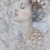 Around the woman’s head is a riot of apple tree blossoms. Branches covered with small white and pink flowers seem to entwine her, creating a feeling of unity with nature. The flowers are depicted with such tenderness that they appear fragile and almost weightless. Their translucent petals, executed in watercolor, convey the finest color transitions and play of light.