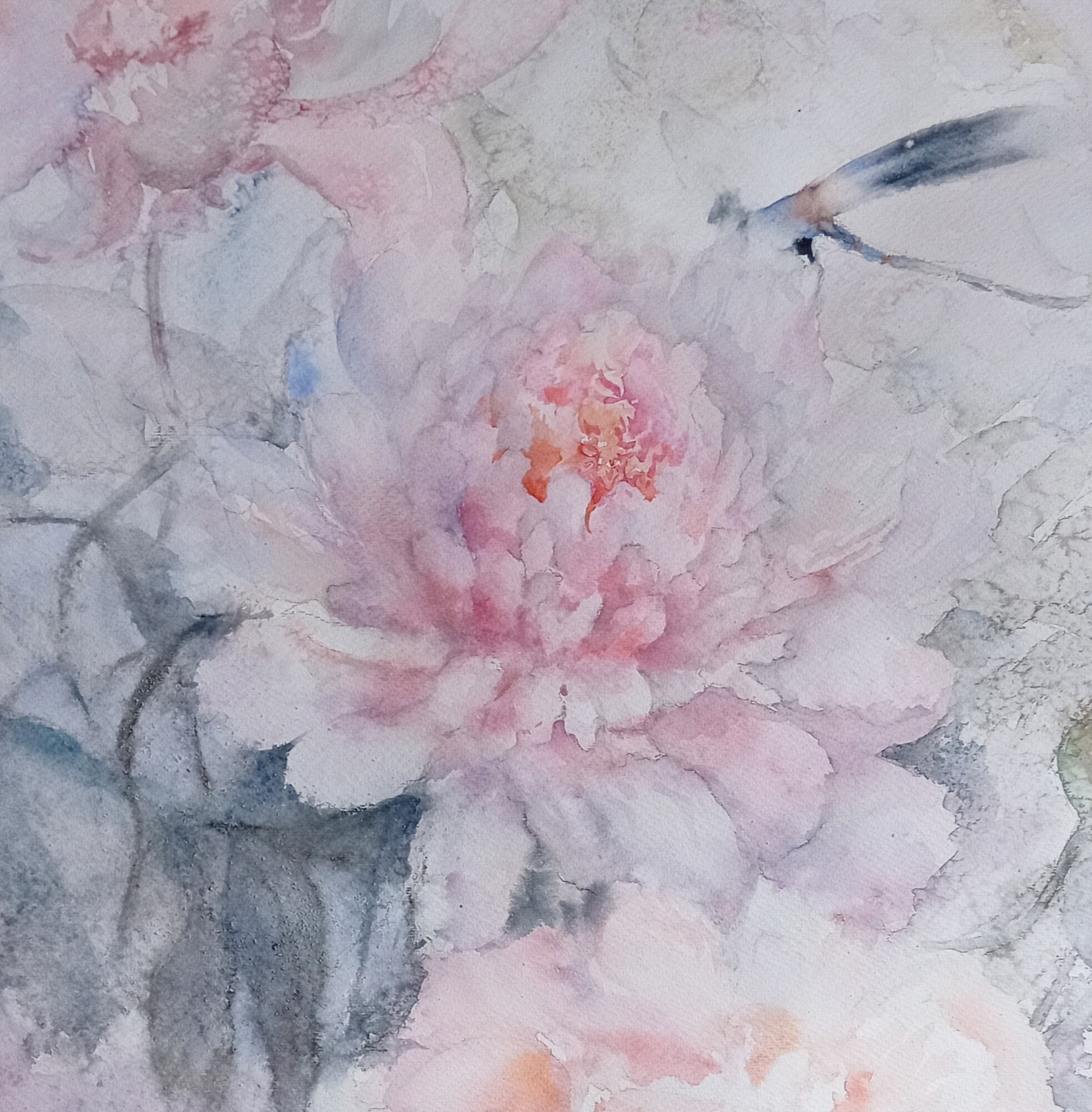 Special attention is drawn to the dragonfly hovering above the peony. Its thin, transparent wings and graceful body are depicted with such lightness that it seems ready to take flight at any moment. The dragonfly, a symbol of transience and ephemerality, adds a touch of poetry and sophistication to the painting. Its presence creates a sense of harmony, unity of nature, and fragile beauty.