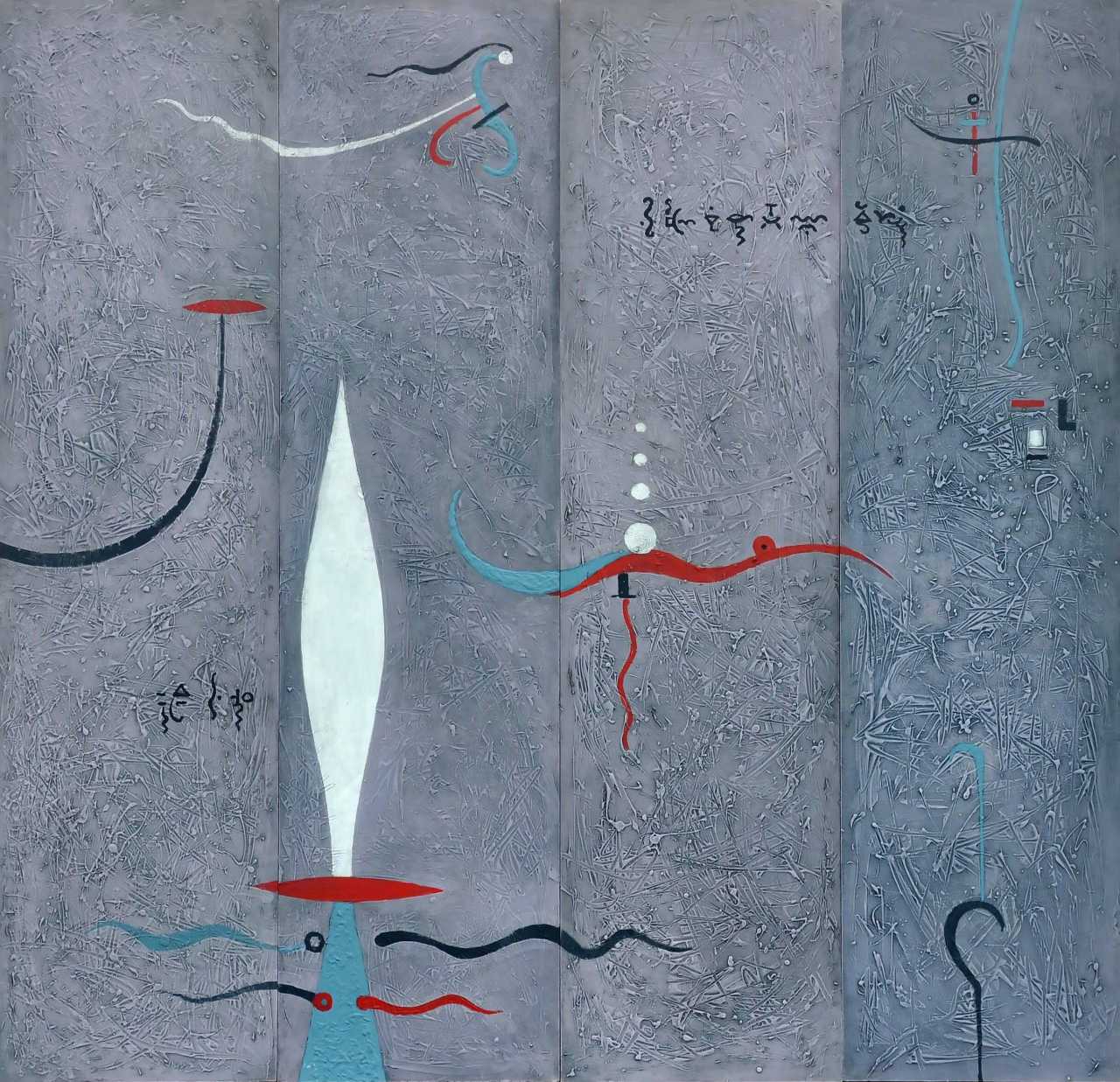 The central element of the painting is a vertical form resembling a candle flame or lotus, illuminated from within. Its white color, contrasting with the gray background, symbolizes purity, spiritual enlightenment, and inner light. Around this center unfold graceful, flowing lines and shapes. Thin, curved lines in red, blue, and black, like threads of fate or energy flows, complement the composition, giving it dynamism and life.