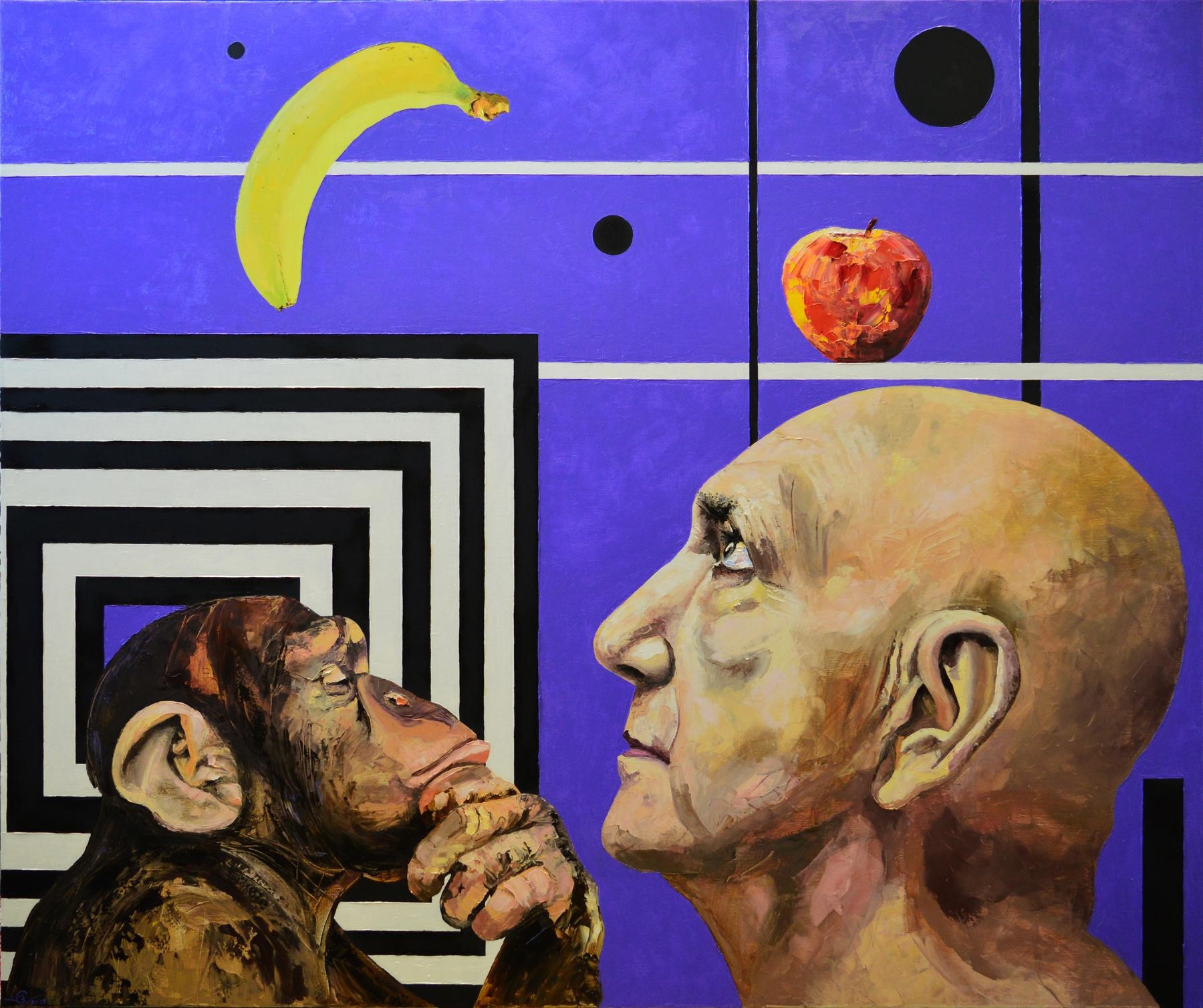 At the center of the painting are two portraits: a portrait of a man and a portrait of a monkey. Both are looking up, as if asking the same question. The man, depicted with wrinkles and traces of life experience, seems thoughtful and a little sad. The monkey, on the other hand, looks curious and naive.