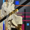At the center of the painting is a statue of Socrates - a symbol of wisdom, philosophy, and the relentless search for truth. However, the image of Socrates is presented in a distorted, fragmented form. The statue seems to fall apart, losing its integrity and significance.