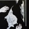 The canvas is divided into several semantic zones. In the center is the silhouette of a woman, rendered in a rich black color. Her contours are blurred and indistinct, as if she is dissolving into the darkness. This is not a concrete image, but rather an archetype, a symbol of femininity, vulnerability, and perhaps, mystery.