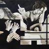 The canvas is executed in a monochrome palette, which enhances the feeling of anxiety and discomfort. The main motif of the painting is the image of a female body, dissected into separate fragments. These fragments seem to “float” in space, surrounded by a chaotic set of hands reaching out to them.