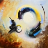 Центральным элементом картины является вихревая форма, напоминающая спираль или водоворот. Внутри этой спирали преобладают яркие контрастные цвета: насыщенный синий, чёрный, белый и жёлтый. Эти цветовые пятна нанесены густыми рельефными мазками, что создаёт ощущение движения и трёхмерности. Белый центр спирали словно излучает свет, как источник энергии.