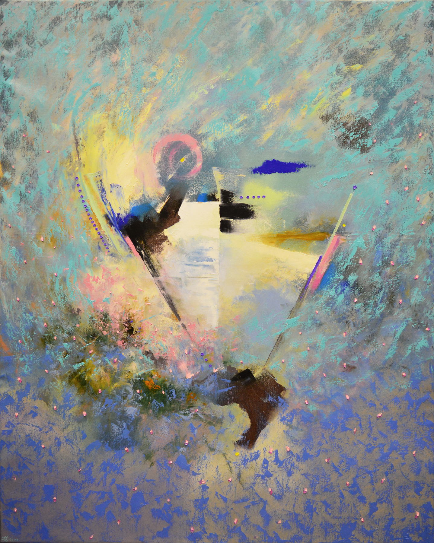 Центральная композиция картины представляет собой сложную структуру из пересекающихся форм и цветовых плоскостей. Здесь преобладают голубые и бирюзовые оттенки, создающие фон, который может ассоциироваться с небом, водой или космосом. На этом фоне разворачивается вихрь цветов: жёлтые, розовые, коричневые и чёрные мазки нанесены густо и экспрессивно, создавая ощущение движения и трансформации.
