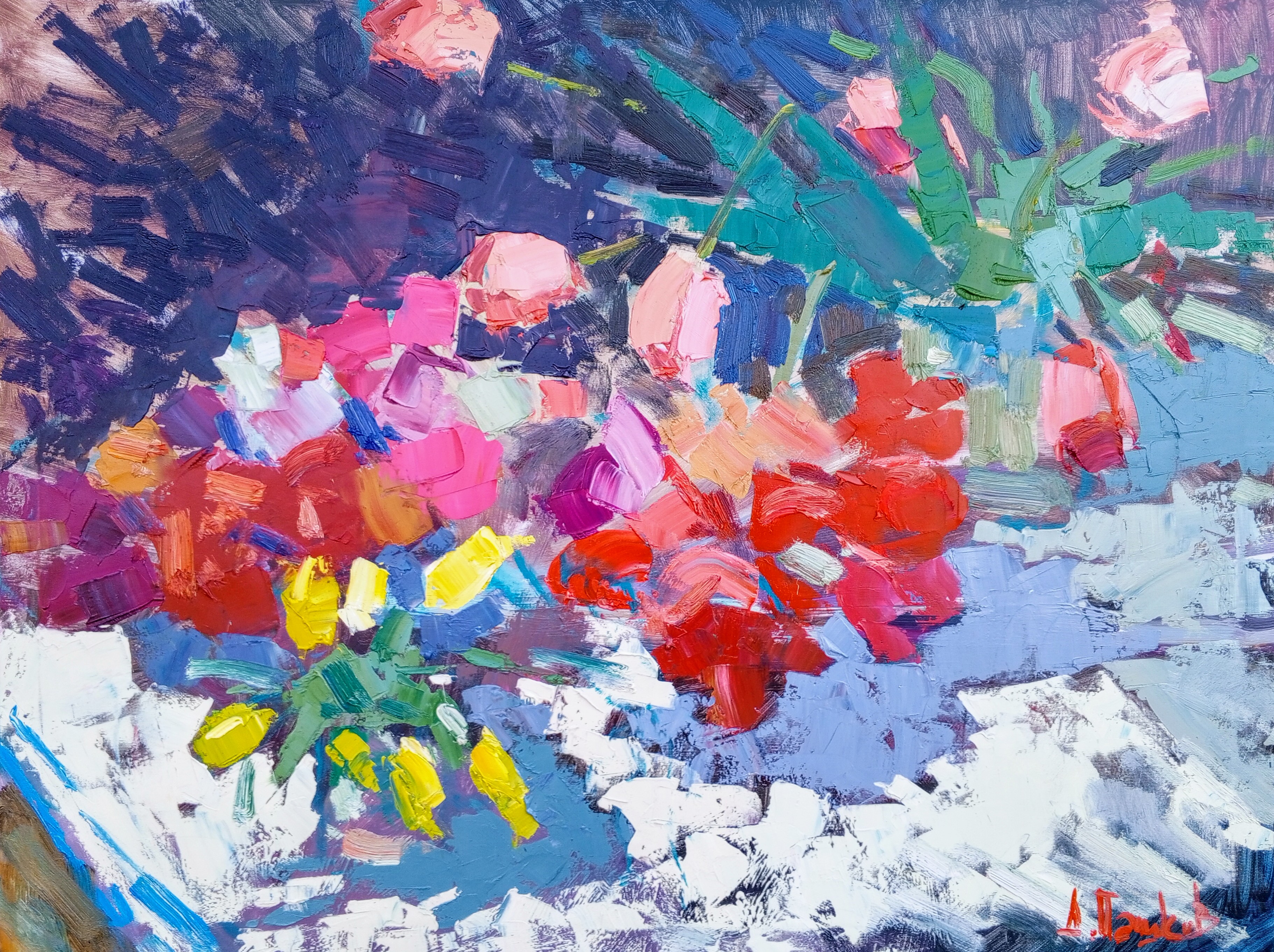 The painting “Night Tulips” by Dmitriy Pashkov is a captivating piece that invites the viewer into a world where night gives flowers a special, magical depth. The work is executed in an expressive, impressionistic style, focusing on color, light, and mood rather than detailed rendering.
