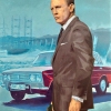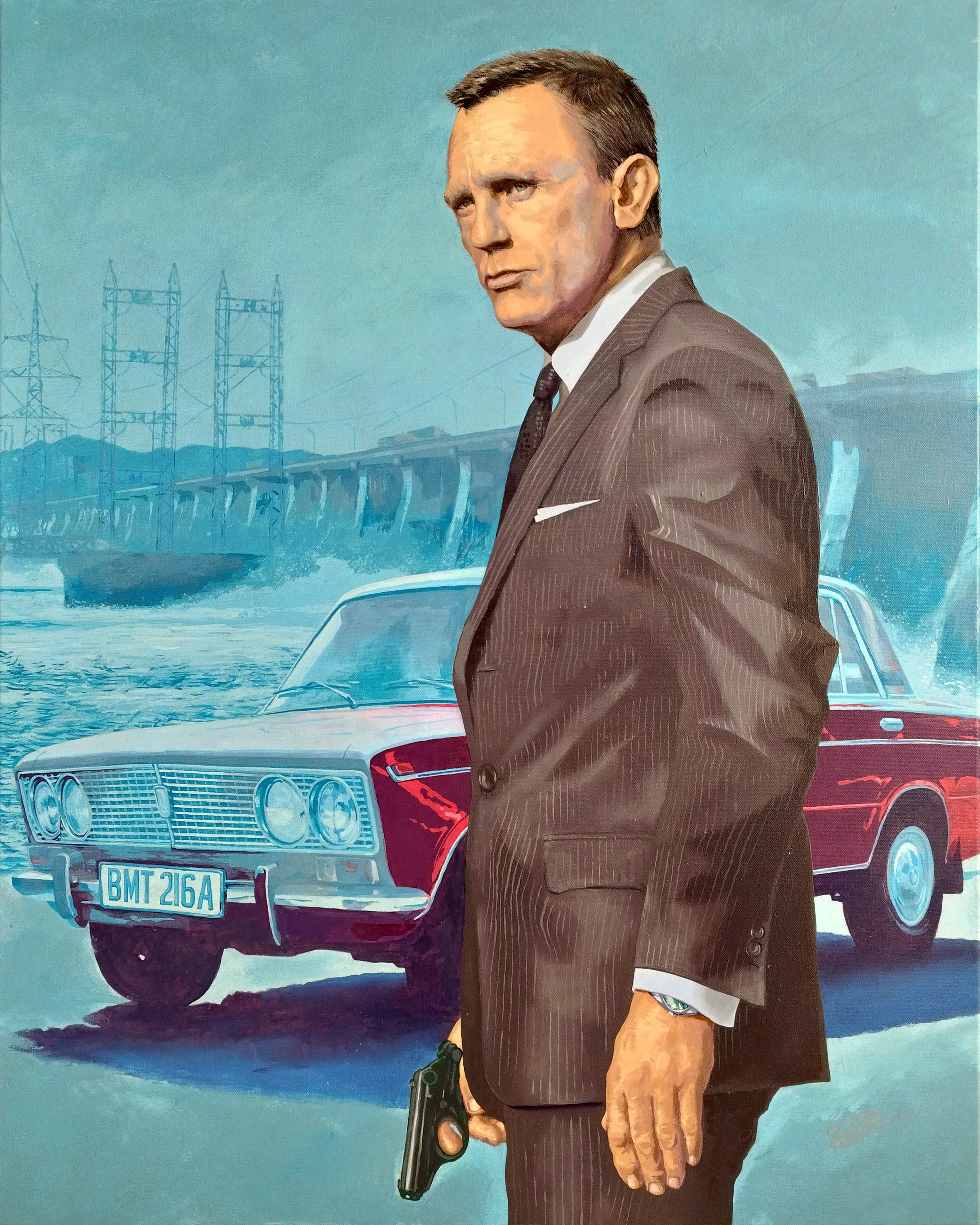 At the center of the composition is a male figure resembling the famous actor Daniel Craig, known for his role as James Bond. He is dressed in a sharp business suit, holding a pistol in his hand. This creates the image of an elegant yet dangerous character associated with the world of espionage and adventure. His gaze is serious and focused, emphasizing his determination.