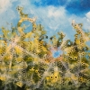 At first glance, we see lush greenery reminiscent of a forest landscape. Sunlight filters through the foliage, creating the sensation of a warm summer day. However, upon closer inspection, this forest reveals its mechanical secrets. Geometric patterns, as if drawn with a compass and ruler, intertwine with organic forms everywhere. Dots resembling gears or pixels cover the surface, giving the image texture and depth.