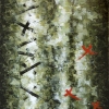 The color palette of the painting combines dark, deep shades of green, brown, and black with lighter, brighter spots of white, green, and red. The dark tones create a sense of depth, mystery, and perhaps some anxiety, while the light spots and bright crosses give the painting energy and expressiveness. The textures created by brushstrokes add liveliness and tangibility to the work.