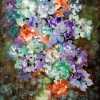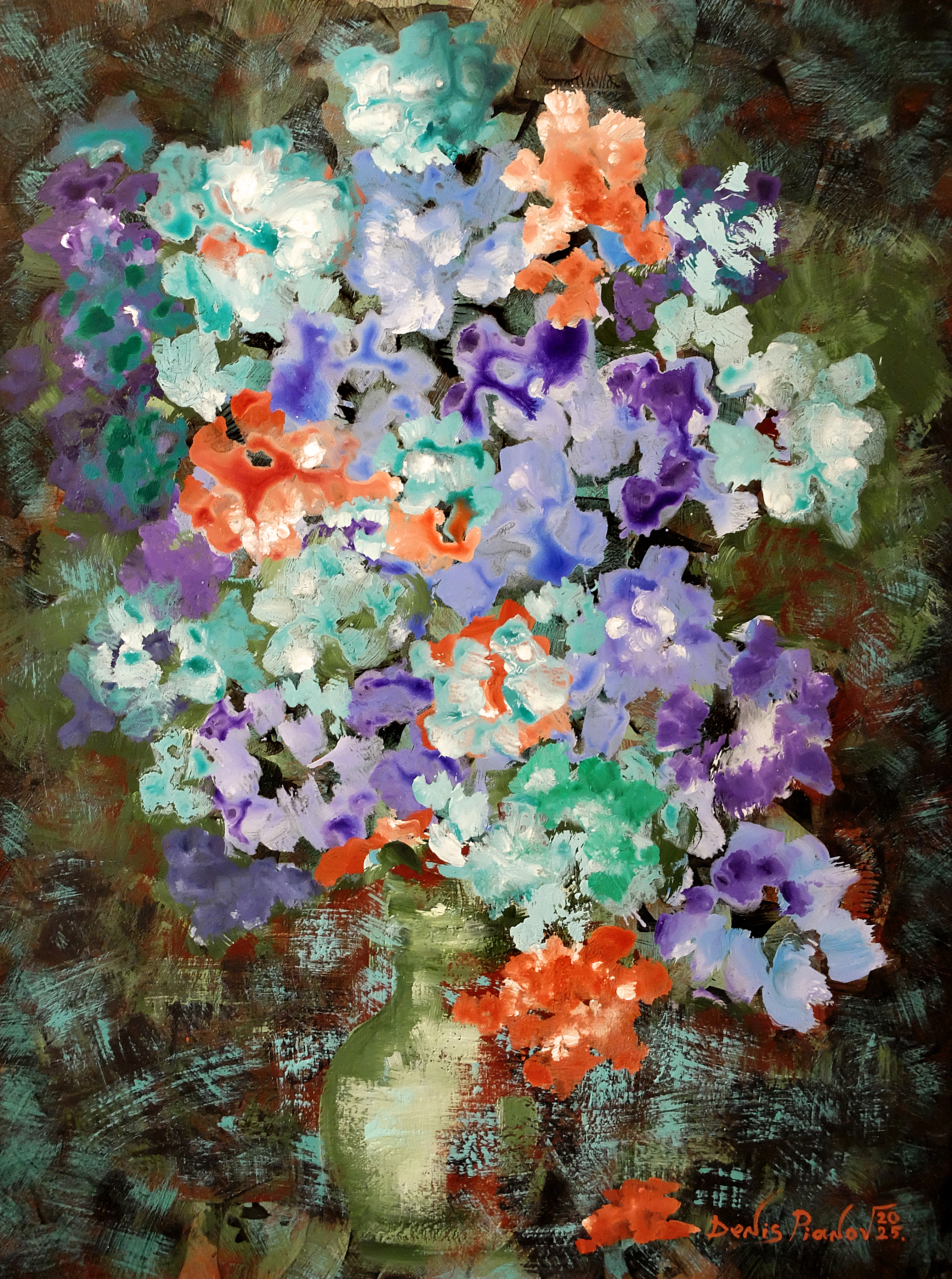 Before the viewer is a riot of color, executed in a thick impasto technique where the brushstrokes are tactile and expressive. The composition centers on a lush bouquet reminiscent of hydrangeas or lilacs. The palette is bright and contrasting: juicy lilacs, mint greens, orange-reds, and blues create a sense of celebration and abundance.