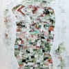 Instead of the traditional academic style, Pyanov chooses the path of abstract mosaic. The figures, barely discernible in the center of the composition, seem woven from numerous color fragments: green, red, black, and white strokes. This technique creates a «pixelation» effect of reality, compelling the viewer to look closely to discern the outlines of the bodies. The contrast between the clear white background and the complex, vibrating texture of the figures themselves emphasizes fragility and elusive grace.