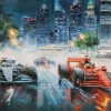 The painting "Royal Races" is a breathtaking dynamic depiction of a Formula 1 race on a city track at night. In the foreground, two racing cars fly across the wet asphalt, leaving sparkling sprays of water in their wake. The artist skillfully conveys the intensity of the fight, the speed and the power of these machines, which embody technology, skill and passion for competition.