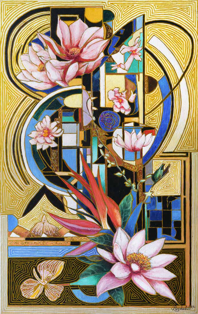 Igor Razzhivin masterfully combines natural motifs with geometric forms, creating a work that enchants with its harmony and symbolism. “The magic of colors” is not just a painting, but a hymn to beauty, life, and art. It encourages the viewer to see the magic in the surrounding world, appreciate the richness of nature, and feel the power of color, capable of evoking emotions and transforming reality. The painting radiates positivity, energy, and leaves an unforgettable impression.