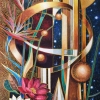 Geometric shapes—vertical and horizontal lines, rectangles, circles, spirals—create a sense of order and structure, while simultaneously reminding of the laws of nature and the cosmos. The golden lines permeating the entire composition add sparkle, luxury, and a mystical glow.