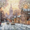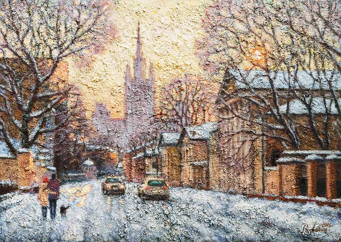 The painting technique impresses with its texture: Razhivin uses dense, relief brushstrokes that make the snow appear truly deep and sparkling, and the frosty air almost tangible. In the golden light of sunset, the tall spires of buildings and frost-covered tree branches form a lace-like pattern. The color palette—a combination of warm ochres, sandy tones, and cool pearly shades—perfectly conveys the atmosphere of a January day when the sun is already setting.