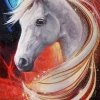 The main focus is on a powerful contrast: the cold noble whiteness of the horse's head is opposed to the blazing fiery background. The animal’s mane, turning into golden whirlwinds, is sprinkled with sparks resembling constellations. Razzhivin uses dynamic, flowing lines to convey the sensation of cosmic movement, as if the horse is galloping through the very fabric of the Universe.