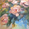 The centerpiece of the composition is a lush bouquet dominated by roses. The petals are painted with broad, free strokes that convey their velvety texture and softness. The pink hues range from soft pastels to richer tones, with touches of golden and yellow shades in the flower centers, adding volume and liveliness. The green leaves, painted using various shades, frame the bouquet, adding freshness and contrast.