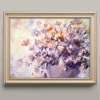 Diffuse light, lilac and peach strokes, an almost weightless bouquet in a vase — this piece captures that very morning when the air seems to glow and thoughts are still gently dozing. The lively texture, the subtle movement of the branches, and the blurred outlines of the flowers create an atmosphere of coziness and inner calm that you want to carry with you throughout the day.