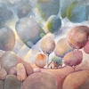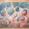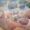 In this piece, I gently tried to combine surreal shapes with a very earthly feeling of home, like a scene from a kind children’s fairy tale. Here, the mountains look like soft balls, the trees resemble pink clouds, and a small cottage hides in the center of this gentle dream.