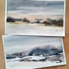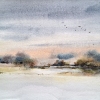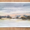 When I painted the watercolor «Winter nature», I wanted to capture the quietest moment of a winter day — when the sunset has already colored the sky with soft peach and gray-blue tones, and the night cold is just approaching.