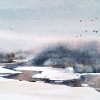 Когда я работала над акварелью «Зимняя речка», мне хотелось передать то особое состояние природы, когда она постепенно засыпает под первым плотным снегом. Тёмная вода реки кажется почти чёрной на фоне ослепительно чистого снега, и в этой простоте рождается главное ощущение картины — зима как время контрастов и ясности.