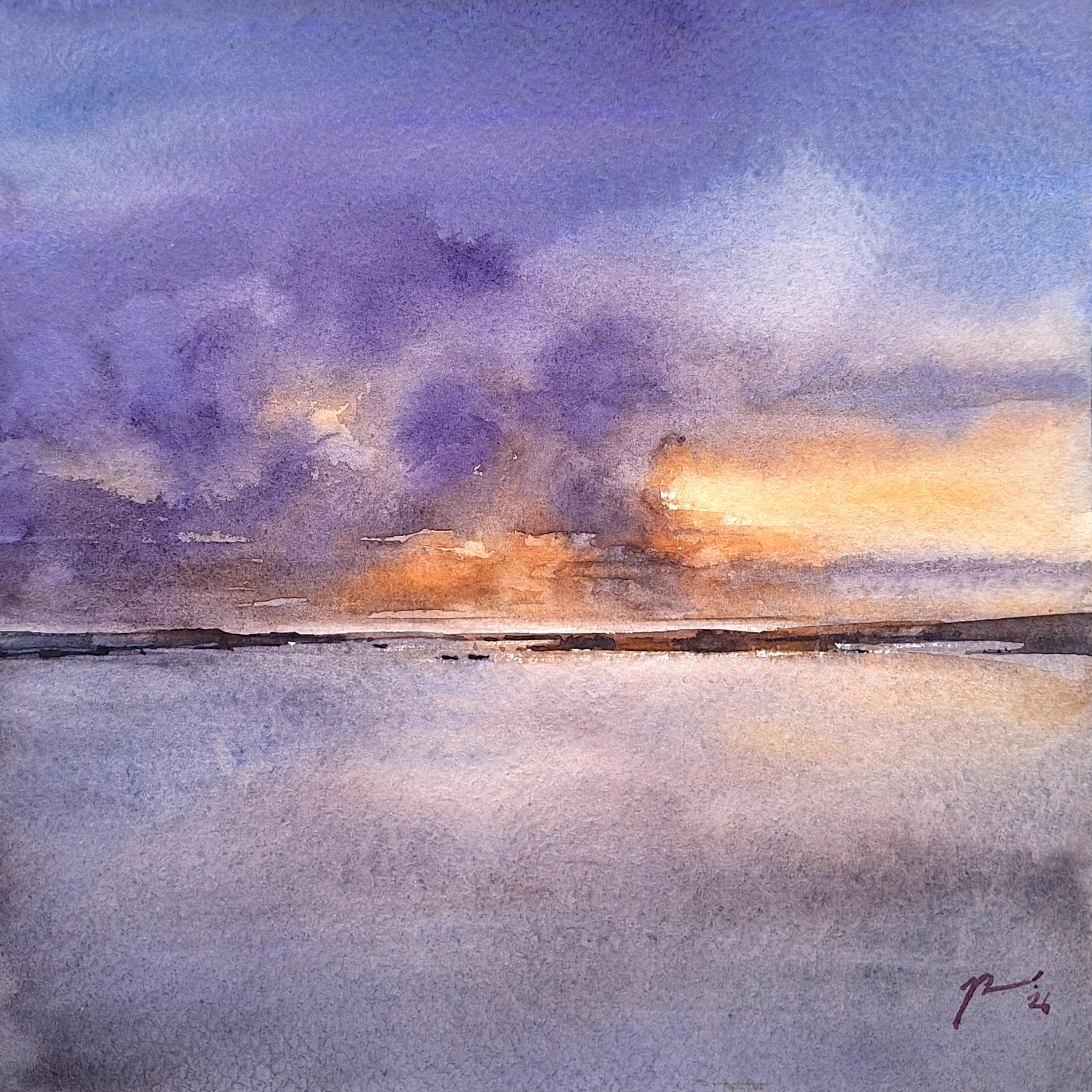 Daria Valevskaya’s painting “Big Lake” is a meditative, minimalist landscape rendered in watercolor, capturing the dramatic moment where sky and water merge.