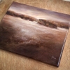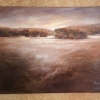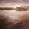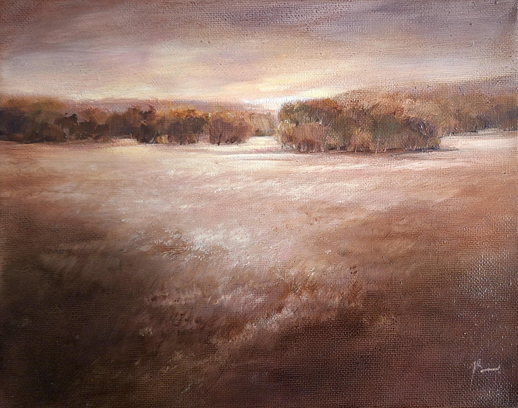 I wanted to convey a state of thoughtful calmness when you are alone with nature. Warm ochre and soft light shades create the feeling of evening light, which diffuses over the field and only gently illuminates the line of trees in the distance.