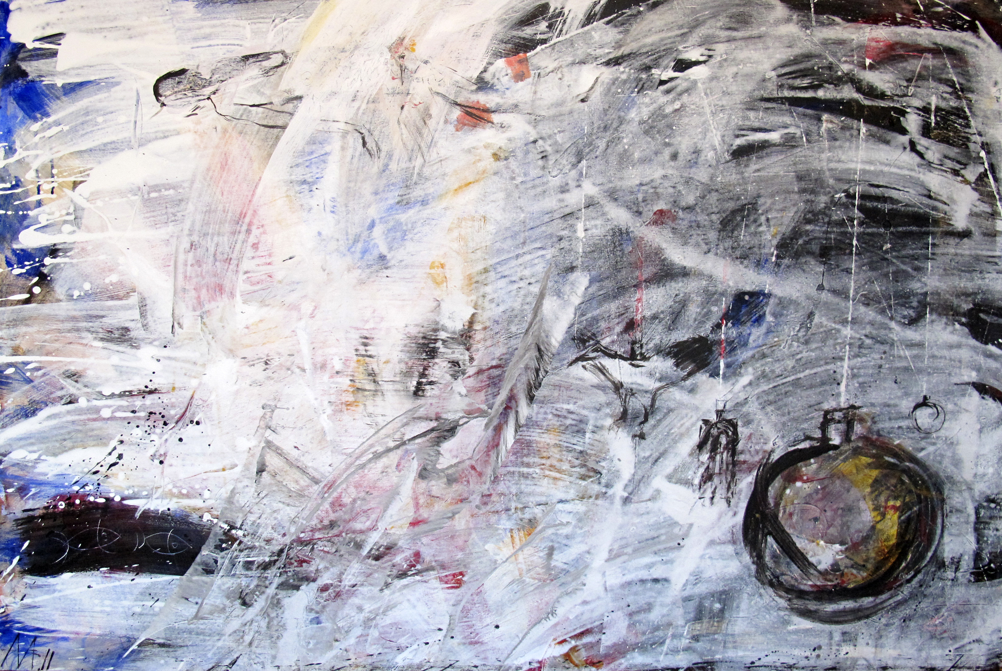 Amid the white chaos, rare muted color accents are visible: spots of red, blue, and yellow. These can be interpreted as remnants of life, memories, or the last flashes of emotion before fading away. These colors, scattered chaotically, add ambiguity and tragedy to the painting.