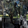 The composition is dominated by dense dark foliage, which hangs thickly over the scene, creating the feeling of a shady, humid space, possibly a greenhouse or park. The green and dark blue tones are applied with broad, confident strokes that emphasize the texture of the leaves.