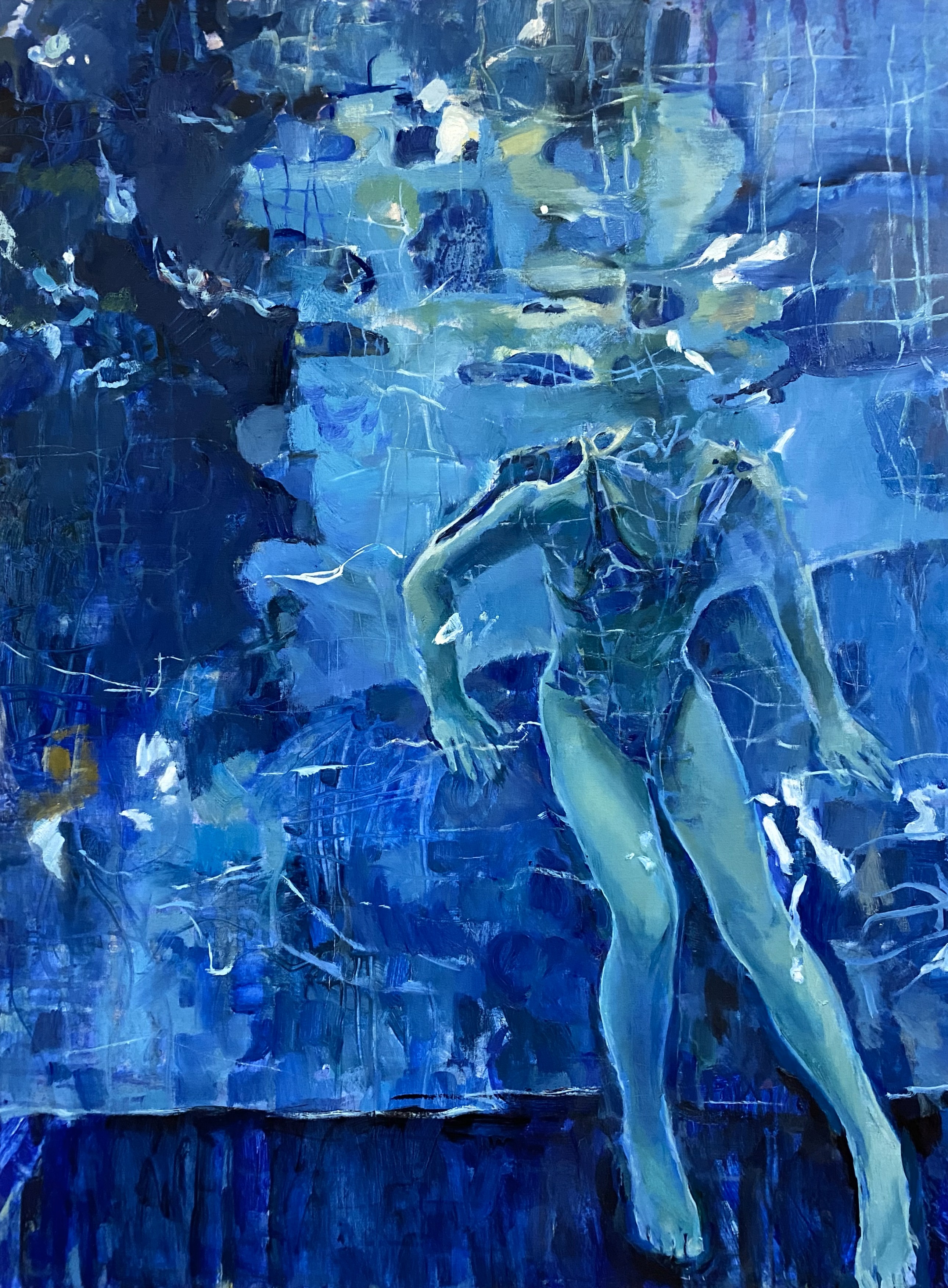 The central image is a swimmer whose figure, rendered with anatomical precision, appears weightless. Her body is pierced by light filtering through the water's surface and distorted by its refraction. This effect is enhanced by the dominant palette: from deep indigo to shimmering turquoise.