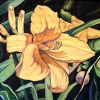 The central focus of the composition is a large bright yellow flower. Its petals, painted with voluminous, textured strokes, seem alive, fluttering in the wind. The color of the petals ranges from rich golden to delicate creamy shades, creating a play of light and shadow. The flower's center, rendered in darker brown tones, gives it depth and realism.