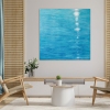 The central element of the composition is the bright blue, serene surface of the water. The surface appears alive, woven from thin, barely perceptible lines reminiscent of a gentle current or ripple. These lines create a sense of depth and infinity of the aquatic space. On the right side of the canvas, a path of moonlight is beautifully depicted, reflecting on the water. These light spots, like shimmering stars on the sea’s surface, give the painting a magical, almost fairy-tale charm.