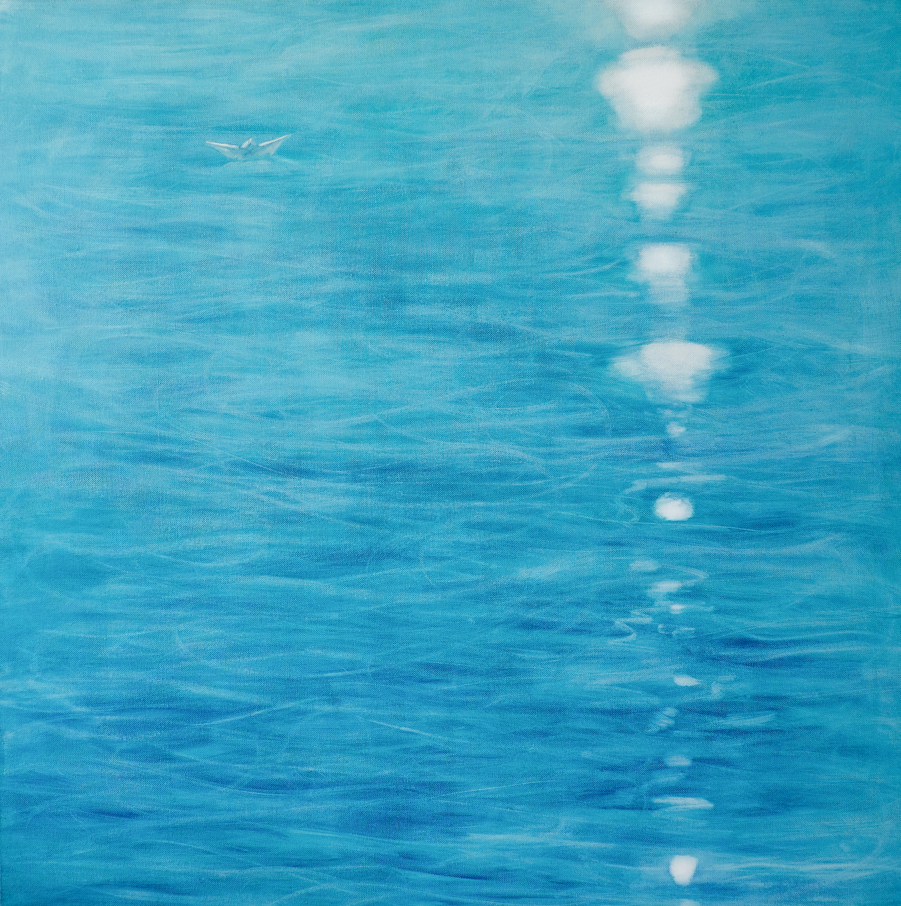 The painting is from the series «Sea of Seas». The amazing color of the water, the sun’s reflections, and a small paper boat.