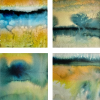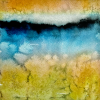 At the top of the composition, a bright, saturated band dominates, reminiscent of a sunset sky or the reflection of light on water. Golden-orange and ochre tones prevail here, creating a sense of warmth and light. This bright area contrasts with the darker, deeper colors located just below.