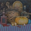 The painting "On a Striped Tablecloth" is an elegant still life, filled with symbolism and warmth. The composition harmoniously unites objects of everyday rural life, creating a cozy and slightly mysterious image.