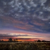 Beneath the celestial expanse stretches a flat landscape. The land, covered with grass and shrubs, is rendered in muted, earthy tones. These tones contrast with the riot of colors in the sky, creating balance and depth. Silhouettes of trees on the horizon, painted with dark, almost black strokes, emphasize the scale of the sunset sky and add drama to the landscape.