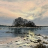 At the center of the composition is a small island covered with trees. Their leafless silhouettes stand out clearly against the sky. These trees, like frozen figures, symbolize the resilience and beauty of winter nature. In the foreground is a body of water, its surface beginning to be covered with a thin layer of ice. Light breaking through the clouds reflects on the icy surface, creating a shimmering, iridescent pattern.