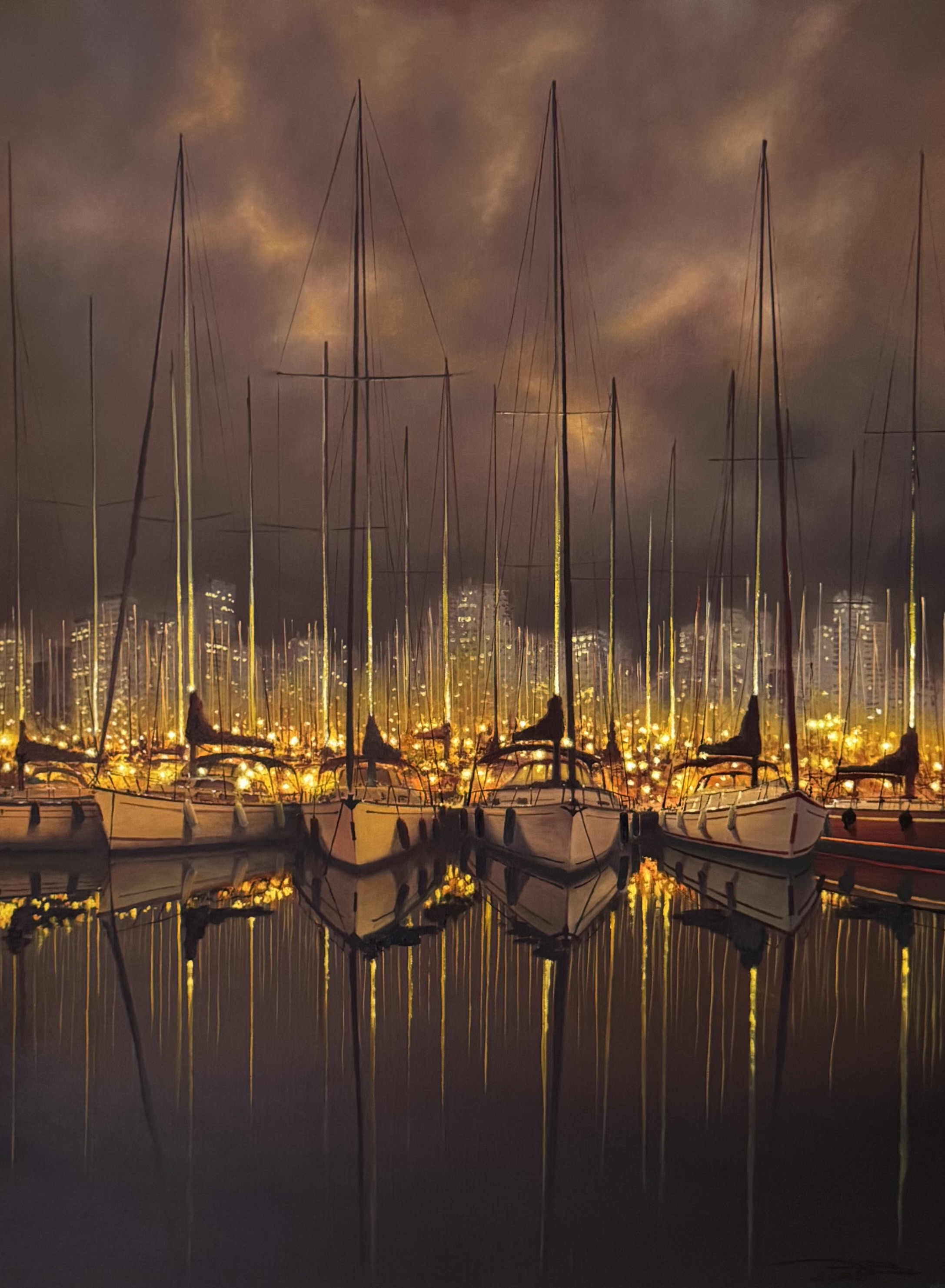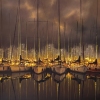At the center of the composition are numerous sailing yachts, their masts reaching into the dark sky like slender, elegant fingers. The city lights in the background form a captivating backdrop, as if the city has turned into a scattering of precious gems. These lights, reflected in the water, double their splendor, creating a shimmering, iridescent pattern.