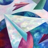 The painting by Marina Tiik «Heavenly Wanderers» (Небесные странники), created in 2021, is a visual embodiment of the artist’s passion for travel and her special attachment to airplanes, which she compares to «wonderful large birds soaring among the clouds.» This abstract canvas, which has participated in many Moscow exhibitions, invites the viewer into a world where reality intertwines with dreams.