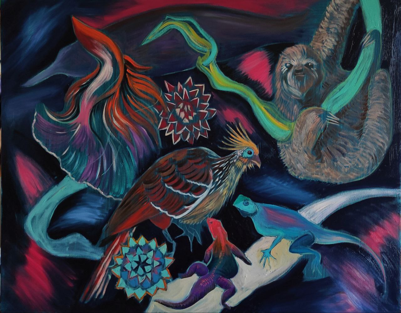 The background of the canvas is dark and deep, allowing all the bright forms to "flare up" on the surface. Around the animals intertwine abstract, flowing lines and shapes reminiscent of lianas or streams of energy, colored in shades of fuchsia, turquoise, and orange. Among them are symmetrical patterns resembling mandalas, which give the composition a mystical order amid the apparent chaos.