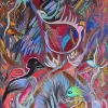 Anastasia Poliakova's painting "Dream" is a vivid and mesmerizing dive into the subconscious world, where reality intertwines with fantasy, and logic gives way to intuition and imagination. The artist creates a space filled with mysterious creatures, exotic vegetation, and an explosive palette of colors.