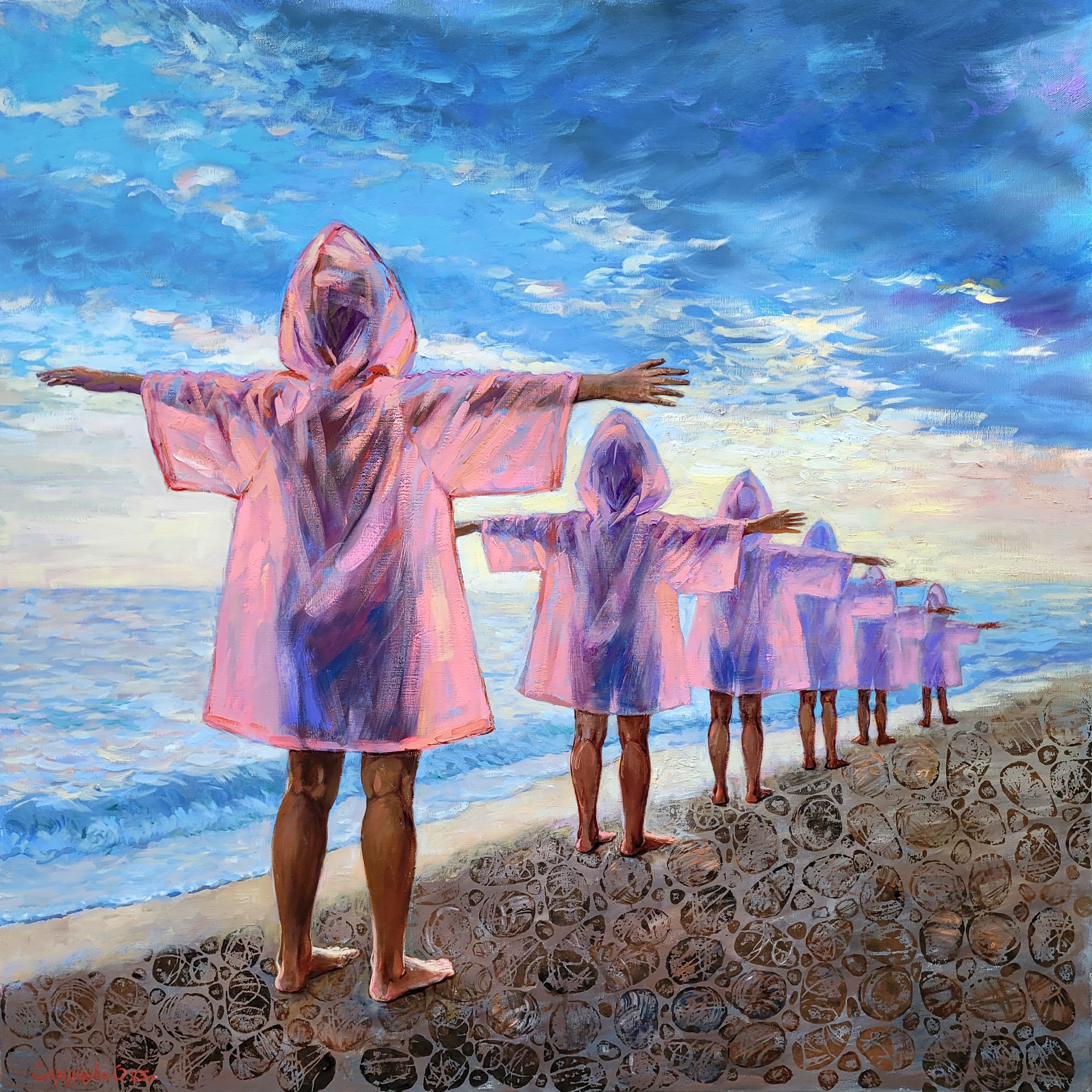 This line is not a strict column but a living star stretched across the sand. They are like steps of time, like reflections of the same soul at different ages. This procession of stars reminds us of the inevitability of the path each must walk alone, yet as part of a collective movement. Their faces are unseen, making them universal images, each of us.